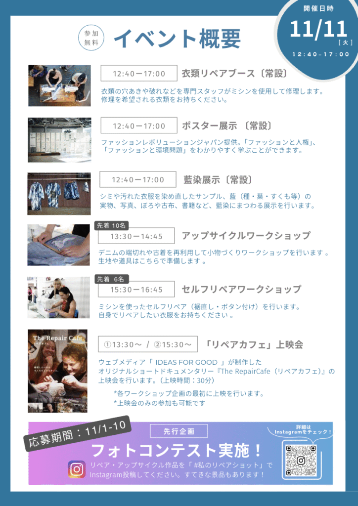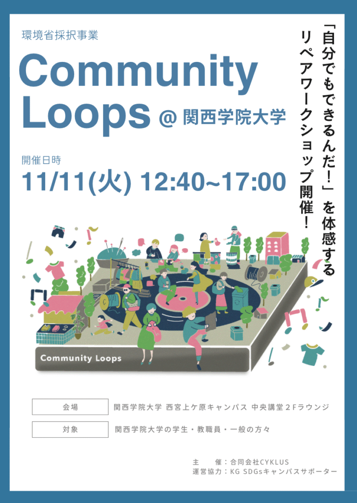 「服がめぐる、つながる、まちのループ」Community Loopsプロジェクトの一環として、関西学院サステナビリティ推進本部公認学生団体KG SDGsキャンパスサポーターと協働して関西学院大学内で「リペアカフェ」を実施します。学生の皆さんと共にモノに愛着を持って使い続けることの価値を共有します。