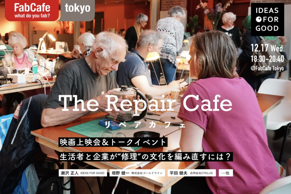 Fab Cafe Tokyoによるドキュメンタリー映画『リペアカフェ』上映会&トークイベント。人々がモノの“修理”を通じて助け合いながら地域の繋がりを再生する姿を描く、さらに、国内の企業でリペアの取組みを実践している方々をゲストに、企業と生活者がともにモノをつくる・使う・再生する責任を分かち合いながら、持続可能な社会を実現する方策を考えるクロストーク。